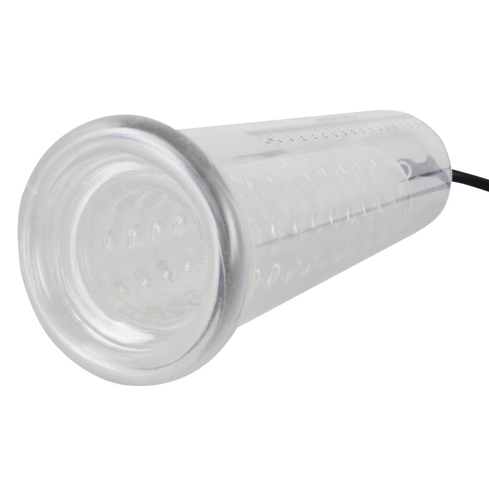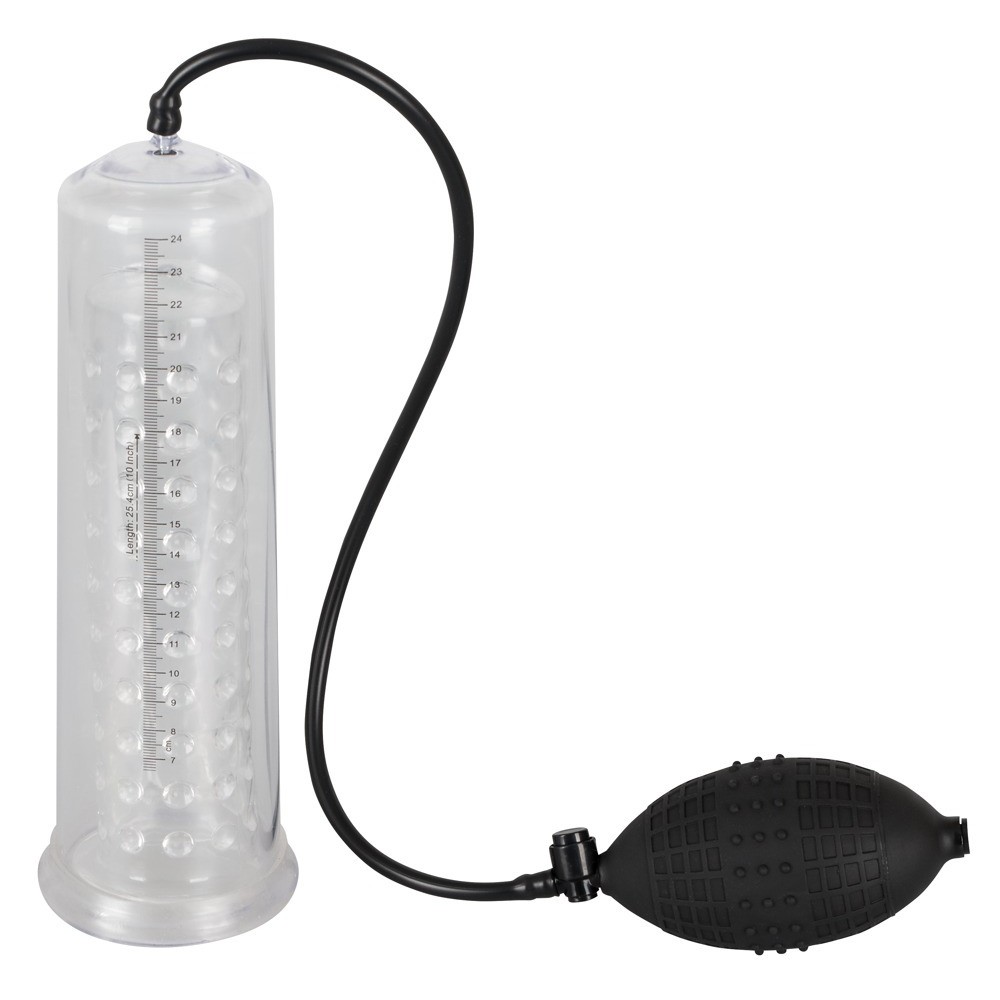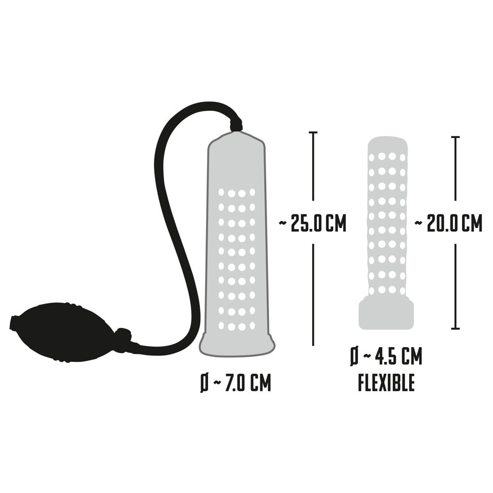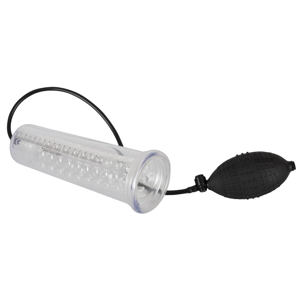 Transparente Penispumpe mit einer knopfartigen Innenhülle (Durchmesser 4,5 cm, flexibel, Länge ca. 20 cm) und praktischer Kugelpumpe. Anhand der Skala können Sie den Erfolg Ihrer Penisvergrößerung verfolgen. Mit Sicherheitsdruckventil.