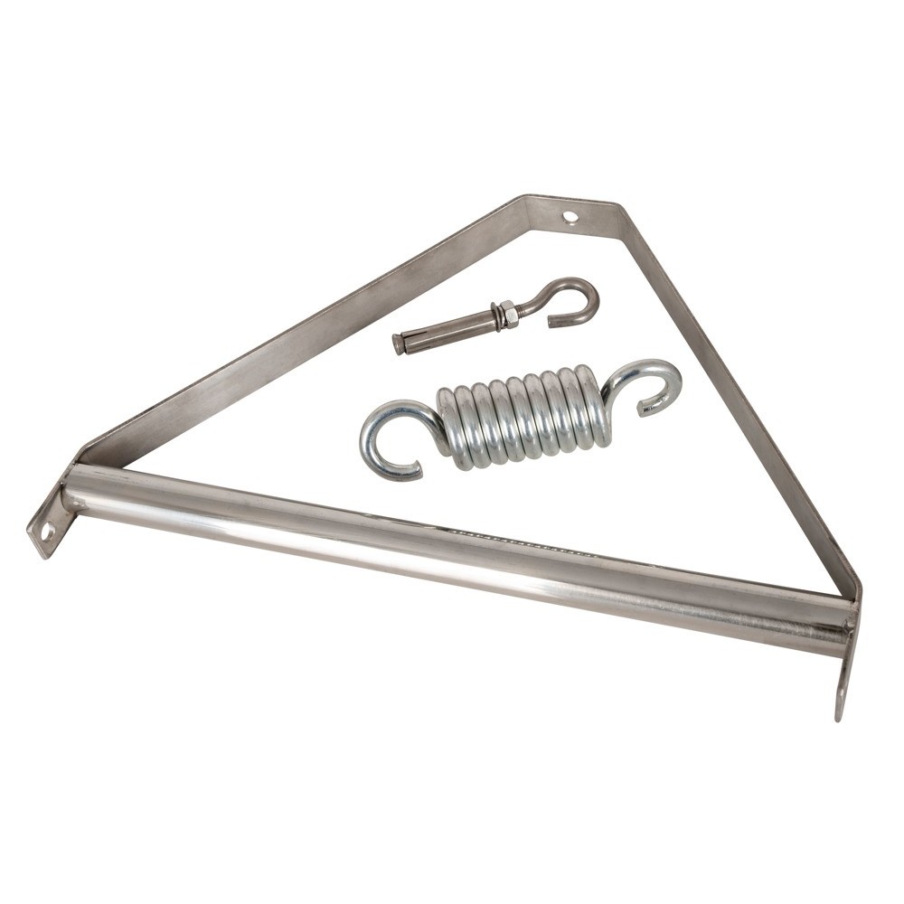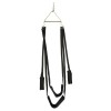 Schwarze Sexschaukel bestehend aus zwei verstellbaren Gurten für den Körper und zwei kurzen Gurten für die Beine. Die Gurte sind an einer robusten Metallaufhängung mit Feder befestigt. Alle Ringe sind für mehr Komfort weich gepolstert.