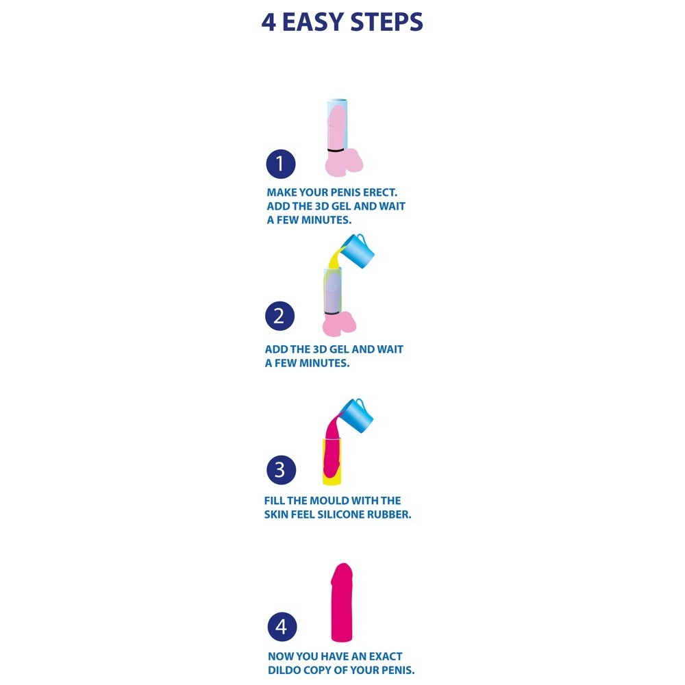Das Set enthält: eine Form (die Verpackung selbst dient als Form), einen Penisgurt, eine Hülle, eine Flasche mit Härtungsmittel, 3D-Gel zum Erstellen der Nachbildung, Silikonkautschuk, ein Paar Plastikhandschuhe, einen Holzspatel und eine detaillierte Anleitung (D, NL, FR, EN).