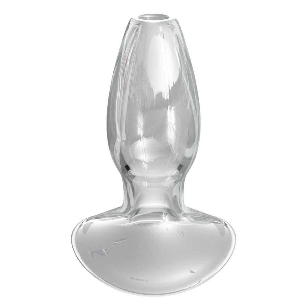 Hohler Analplug mit Sicherheitsbasis, die ein zu tiefes Einführen verhindert. Perfekt für erfrischende Einläufe und sensorische Spiele mit einem Mini-Vibrator. Mit einzigartigem, transparentem Design aus Borosilikatglas, widerstandsfähig und hygienisch.