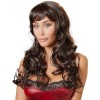 Une perruque artificielle de haute qualité, brun foncé, avec une frange et des pointes légèrement ondulées.