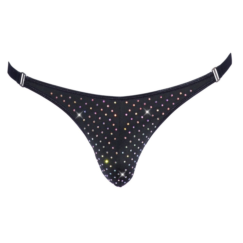 Extravaganter schwarzer String von Svenjoyment mit zahlreichen bunten Strasssteinen auf der Vorderseite. Das Material ist sehr elastisch und garantiert höchsten Tragekomfort.