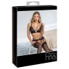 Das Set von Abierta Fina besteht aus einem Mieder und einem String mit Strumpfhaltern, ohne Schritt. Es ist aus feiner, elastischer schwarzer Spitze gefertigt, kombiniert mit weichem Samt und raffinierten Details aus silbernen Ringen und Ketten.