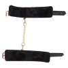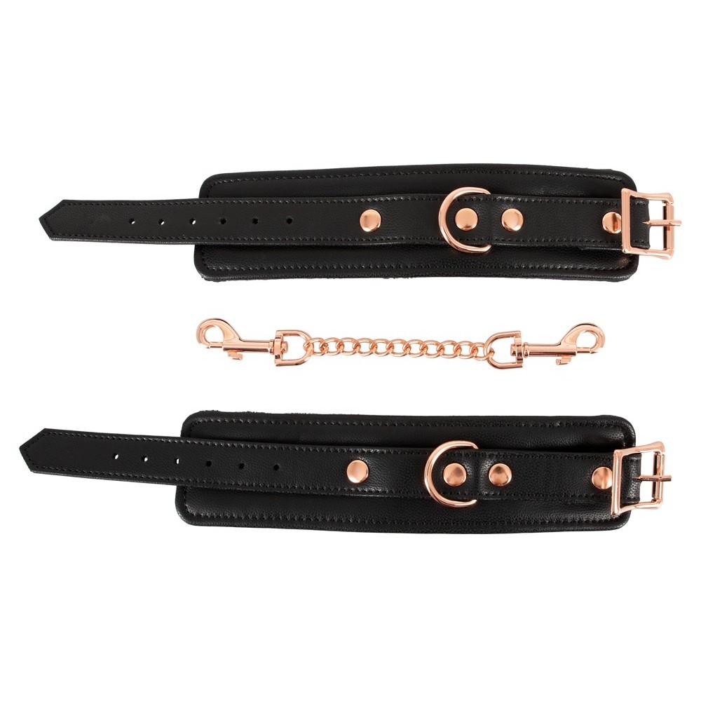 Robuste Handschellen von Bad Kitty in elegantem Lederlook mit einer Verbindungskette und Details aus roségoldfarbenem Metall. Die Handschellen sind innen sanft mit Plüsch gepolstert. Jede Handschelle verfügt über eine Öse, an der die mitgelieferte Verbindungskette mit Druckknöpfen befestigt werden kann. Die Handschellen lassen sich mit den Schnallenverschlüssen von 15 bis 21 cm einstellen. Die Verbindungskette mit 2 Druckknöpfen ist 22 cm lang.