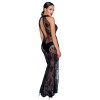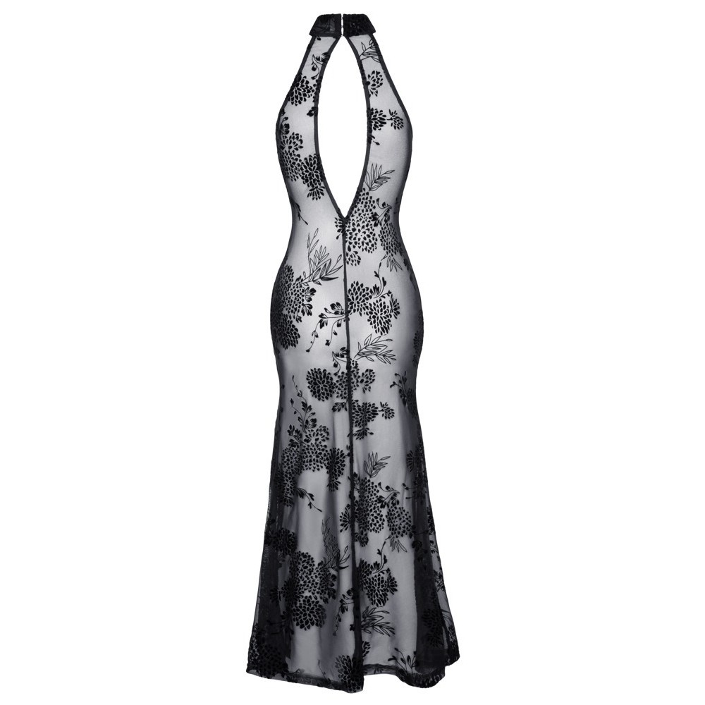 Langes, ärmelloses Kleid von Noir, vollständig aus elastischem Powernet gefertigt und mit einem zarten, florigen Flockdruck überzogen. Das Modell ist figurbetont, mit einem hohen Schlitz vorne am Bein, einem hohen Kragen, der hinten mit einem Knopf geschlossen wird, und einem eleganten ovalen Ausschnitt am Rücken.