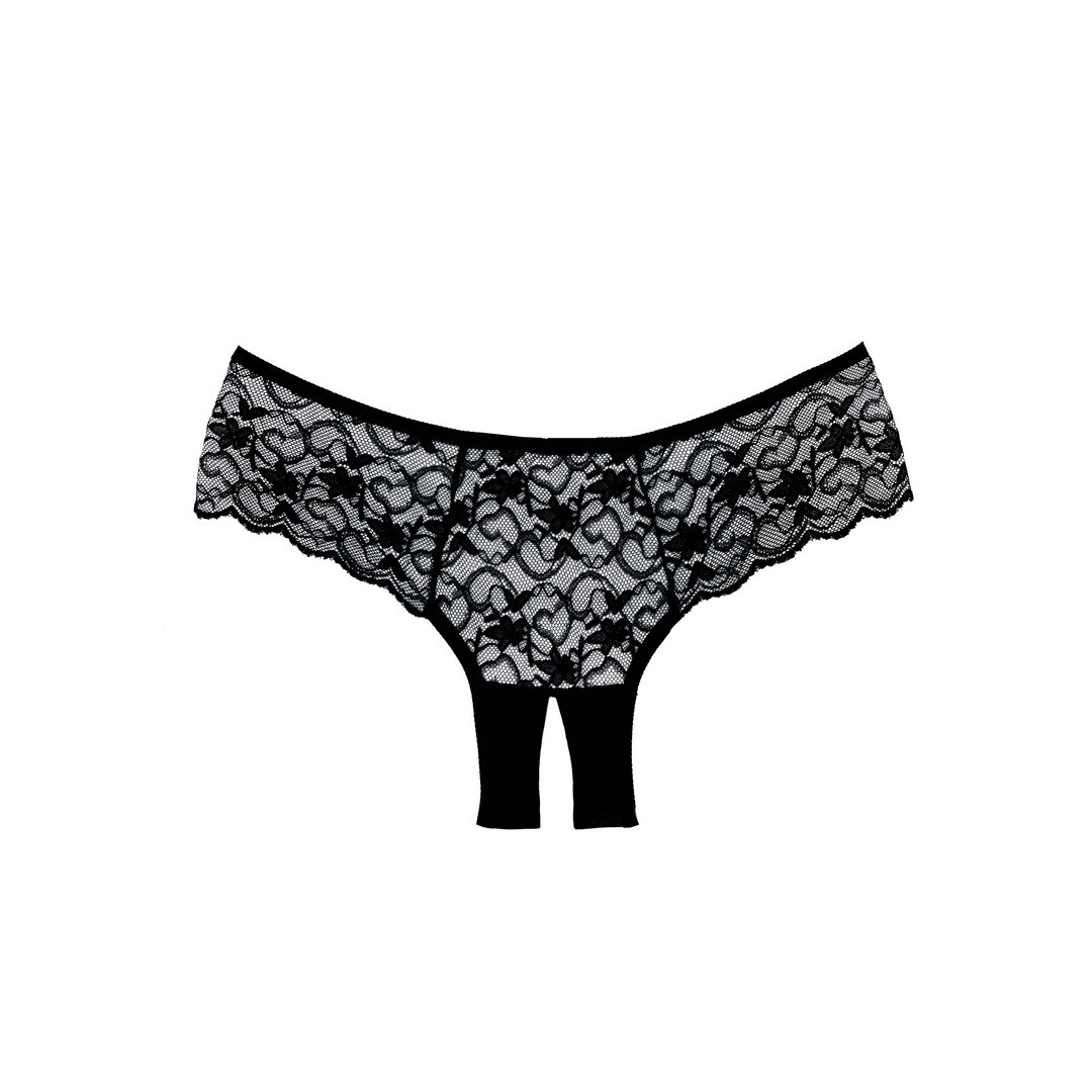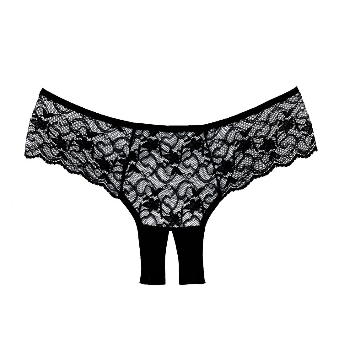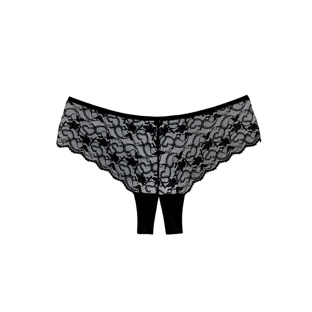 Un tourbillon de dentelle festonnée recouvre vos hanches et votre derrière dans cette somptueuse culotte coupe garçon à gousset ouvert.