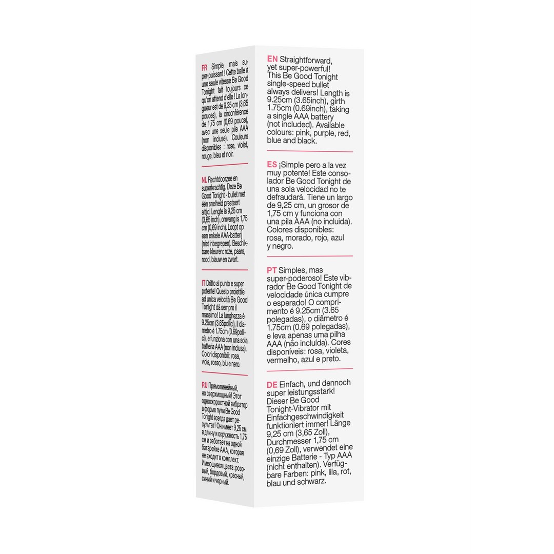 Simple, mais incroyablement puissant! La balle vibrant Be Good Tonight est synonyme de plaisir immédiat et efficace. Son design compact et sa vitesse unique garantissent une stimulation intense et précise quand vous le souhaitez.