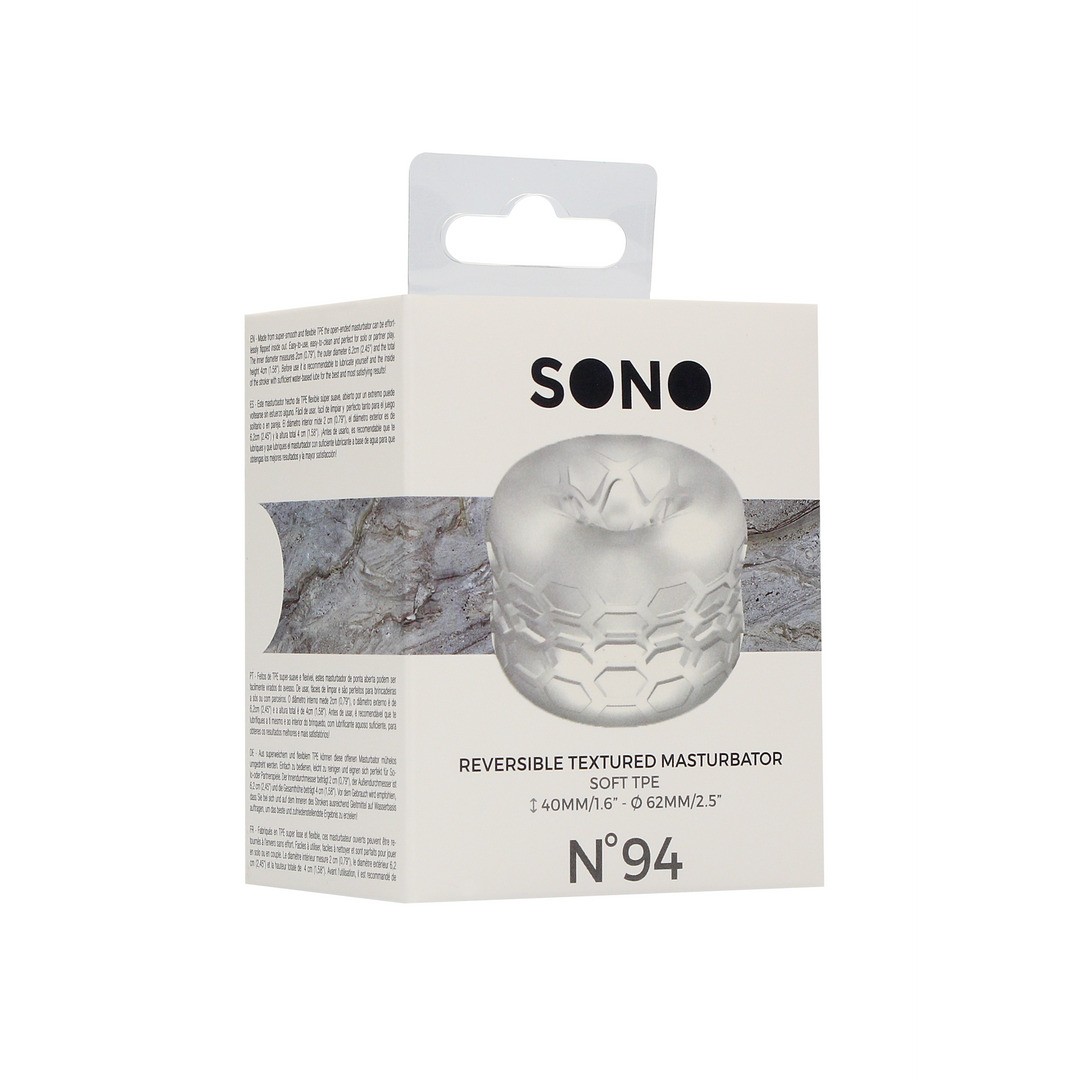 This masturbator also has two different internal textures (one on each side), is super elastic and designed to fit any size. For the best experience, it is recommended to apply water-based lubricant to the penis and inside the masturbator before use.