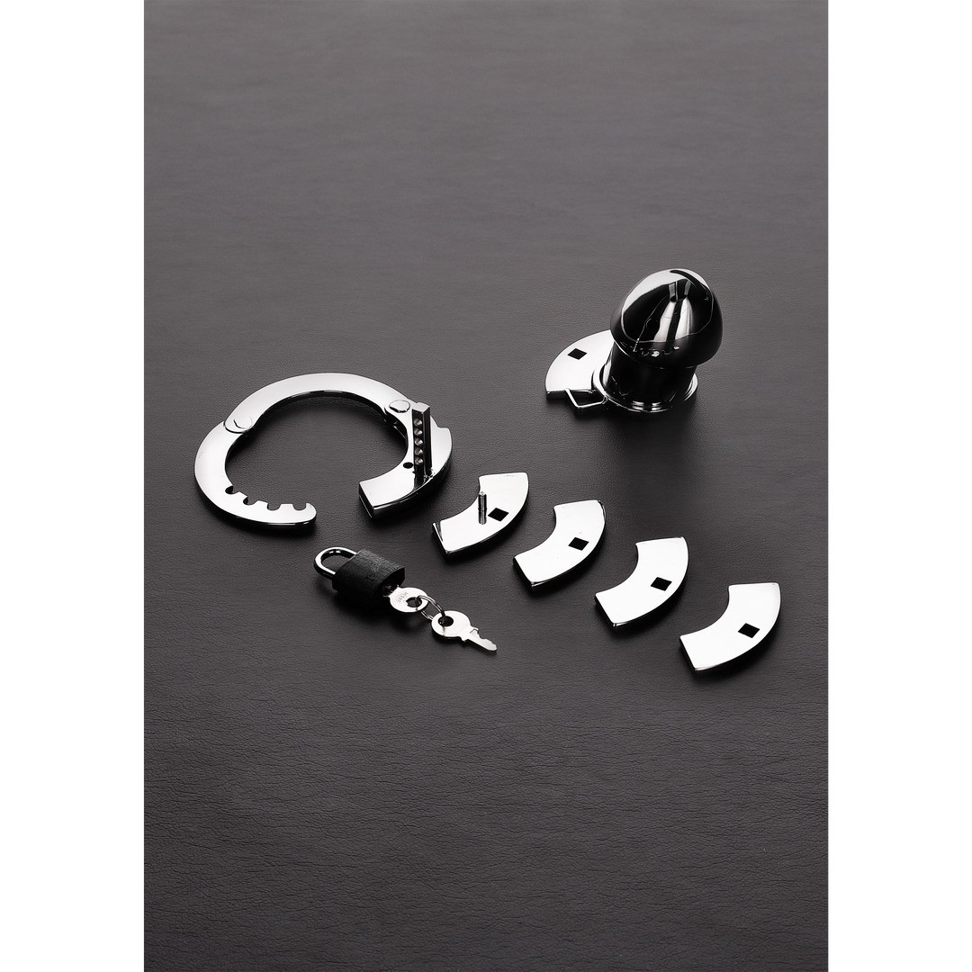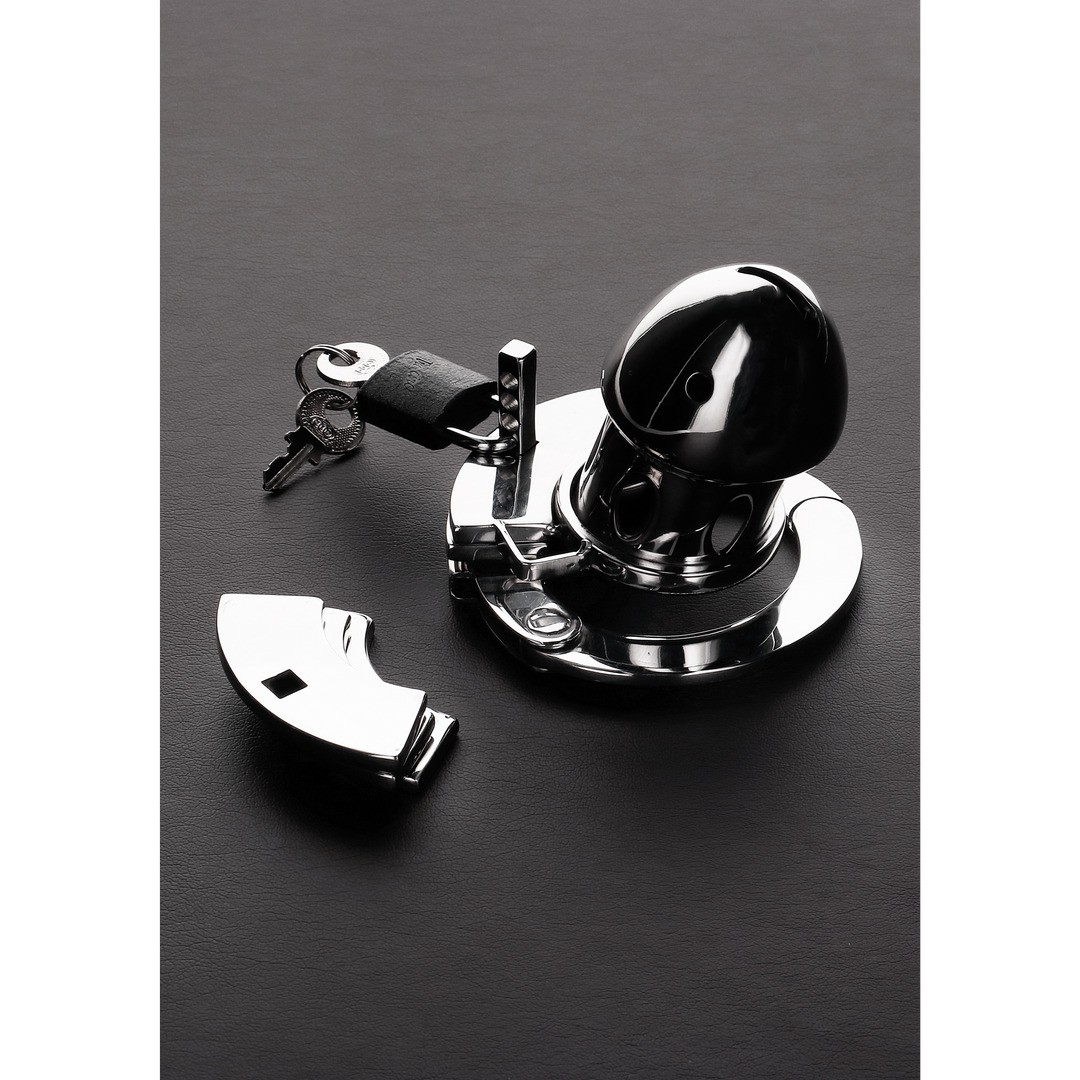 Avec un design similaire à celui d'une menotte, l'anneau de base de cet appareil vous permet de choisir entre 4 tailles différentes. Fixez l'anneau à l'aide du système de plaque et de goupille, en maintenant les testicules fermement dans les limites de cet anneau en acier inoxydable.