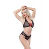 À la limite de la séduction, cet ensemble deux pièces est tout simplement inoubliable. Le haut dos nu est rehaussé d'anneaux dorés au niveau du cou, avec une large bande de maille crochetée qui entoure le dos, tandis que de fins rubans rouges ornent le devant. Le string présente un design triple, avec une partie avant sans entrejambe, des détails en ruban à l'arrière de la taille et une partie arrière entièrement découpée avec des bretelles réglables en satin.