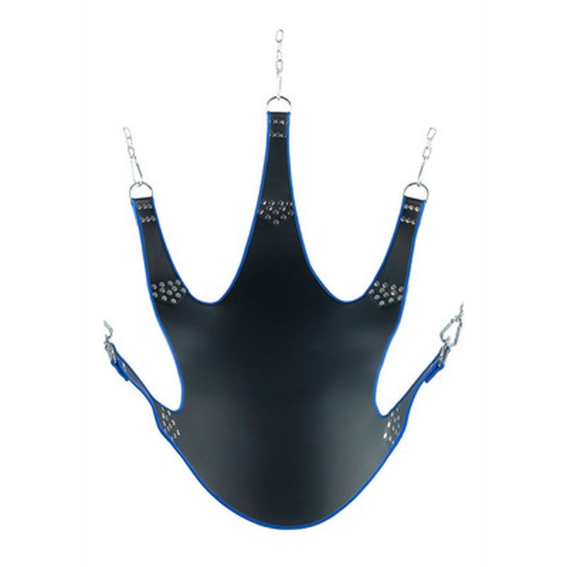 Balançoire en cuir bleu à 5 points présente une forme rectangulaire spacieuse et confortable. Les finitions rouges lui confèrent un style audacieux et sophistiqué.