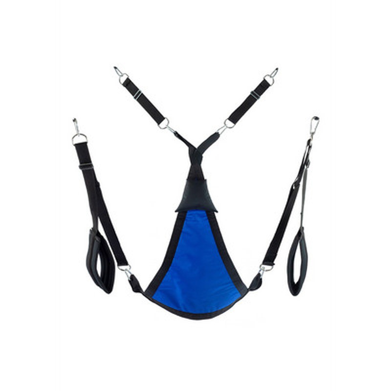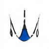 Ce balançoire en tissu bleu a été conçu avec une forme triangulaire et un tissu camouflage. Il s'ajuste à l'aide de 3 ou 4 points de fixation. Il comprend les accessoires suivants: 4 crochets avec mousquetons métalliques, des repose-pieds rembourrés (11 cm de large) et un coussin triangulaire noir (24 x 20 cm).