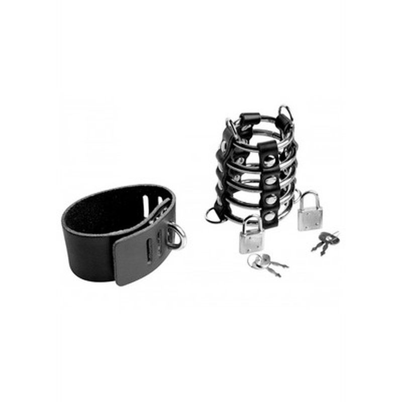 Deux sangles en cuir réglables maintiennent la cage fermement en place, assurant un confinement total et rendant toute tentative d'évasion impossible. L'une des sangles entoure le pénis et les testicules, tandis que l'autre agit comme une pince à balles, serrant fermement la base du scrotum.