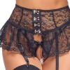 Das Set „Abertura Fina“ besteht aus einem Halbschalen-BH, einem Rock mit Strumpfhaltern und einem String ohne Schritt. Alle drei Teile sind aus weicher, zarter und elastischer schwarzer Spitze gefertigt und mit eleganten Accessoires in Roségold-Tönen versehen.