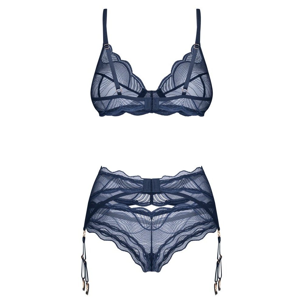 Un ensemble élégant et sensuel! L'ensemble transparent Nightly Blue d'Obsessive comprend un soutien-gorge à armatures, un porte-jarretelles et un string.