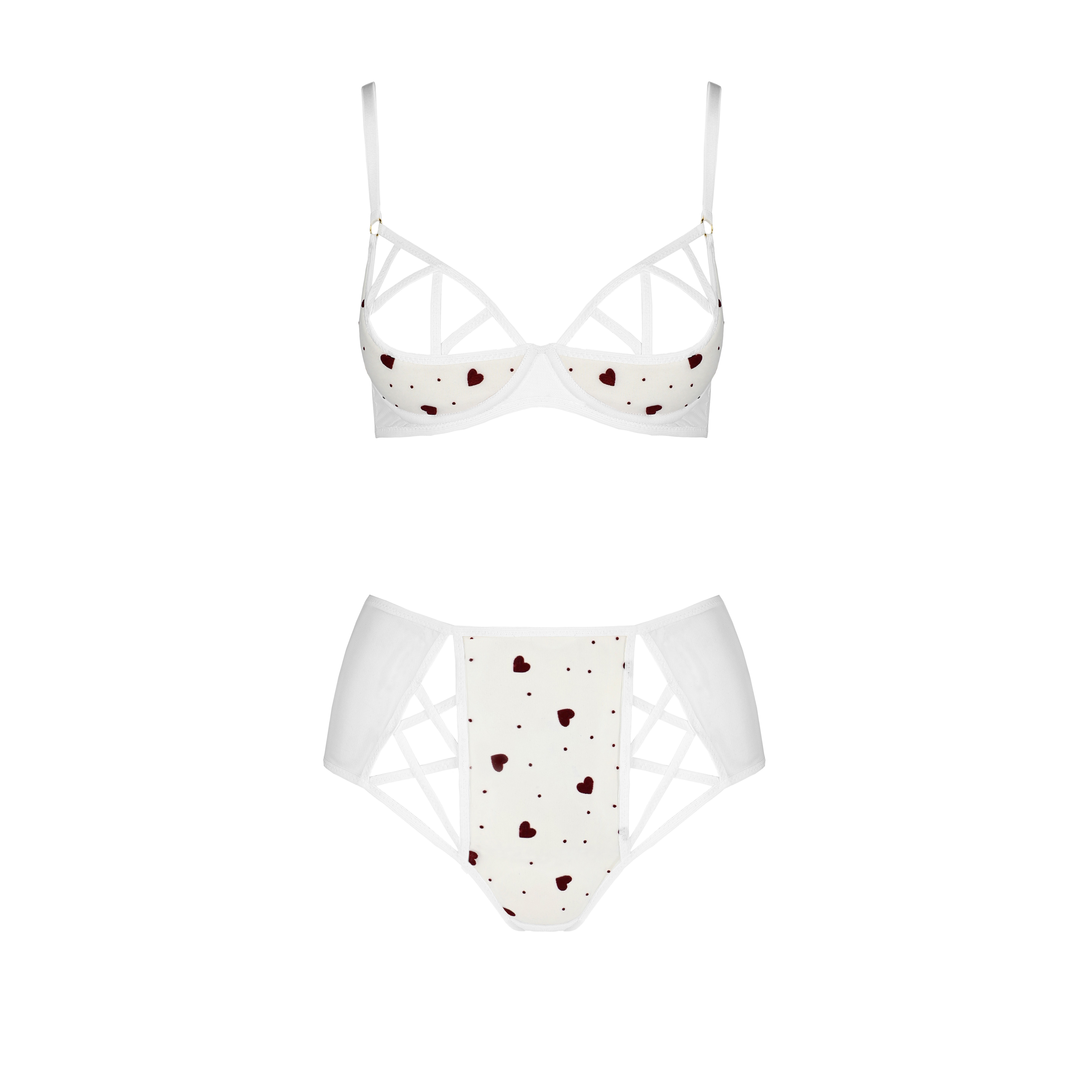Le soutien-gorge, doté d'armatures renforcées et de découpes stratégiques, assure un maintien idéal, soulignant vos courbes avec sophistication. Le string, en tulle délicat avec un motif romantique en forme de cœur, ajoute une touche irrésistible à l'ensemble.