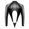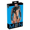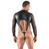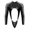 Le body string noir moulant de Svenjoyment a des manches longues. Il est d'un style provocateur car il est fait d'un aspect mat opaque avec des inserts transparents en powernet. Il est doux et extensible, ce qui le rend très confortable. Il présente une large découpe avec des anneaux sur le devant. Le body est également doté d'un col montant et d'une fermeture à glissière sur la poitrine. La poche est également dotée d'une fermeture éclair rembourrée.