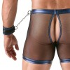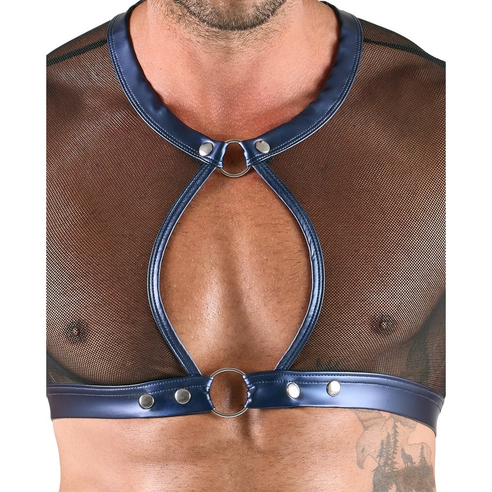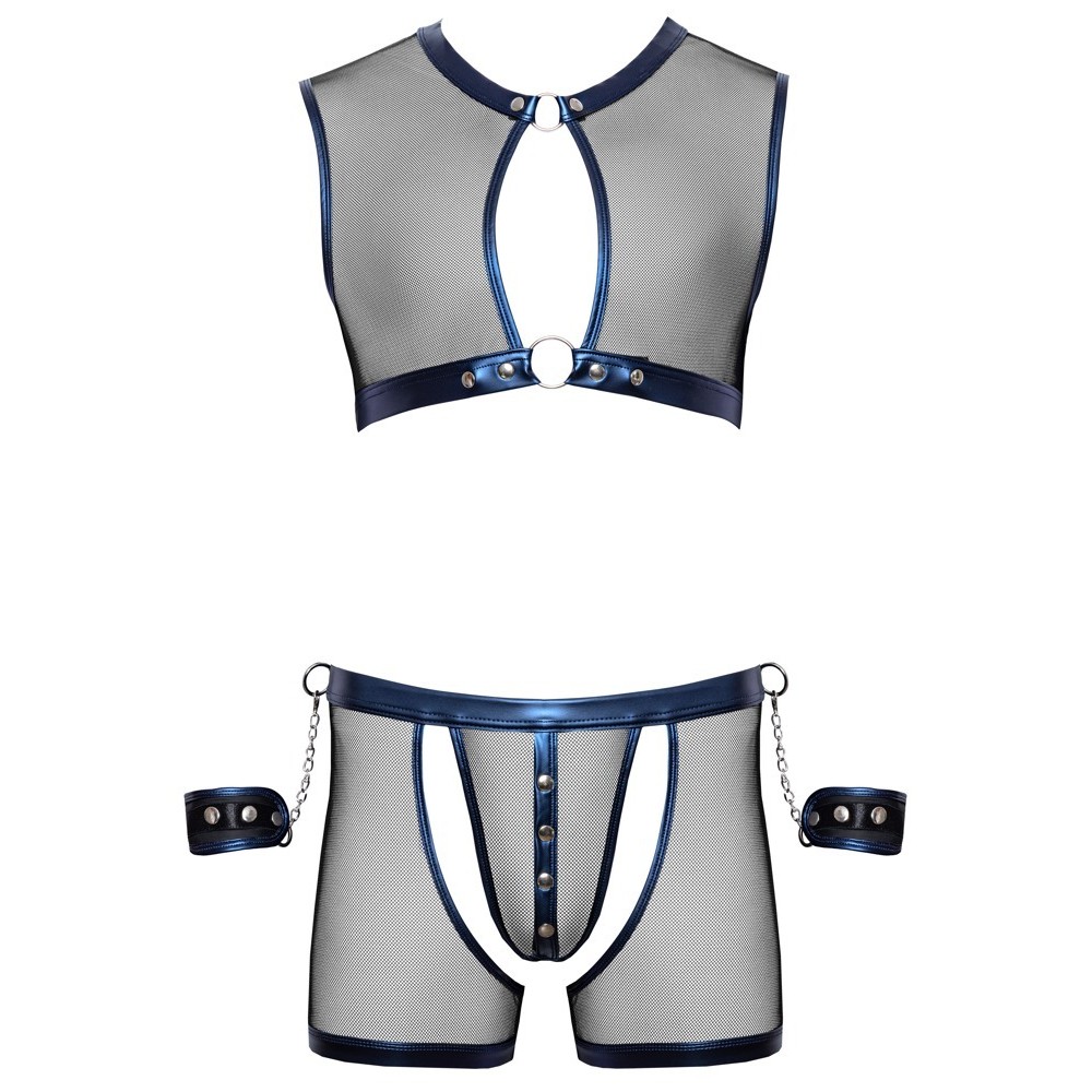 Un haut court et moulant, un pantalon moulant et 2 menottes de Svenjoyment Bondage dans un ensemble. L'ensemble est fabriqué en filet noir transparent, doux et extensible, avec un magnifique tissu bleu métallisé cousu.