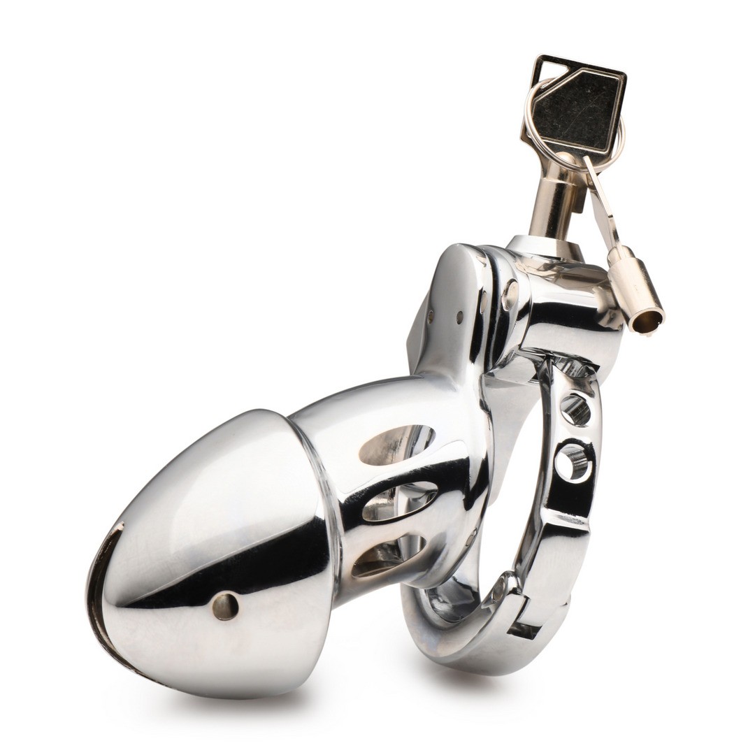 Cage de chasteté métallique ajustable, sûre pour une utilisation prolongée, avec serrure à poussoir et design confortable.