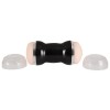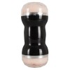 Skin-coloured masturbator with black and silver cover. The inner tunnel, textured for maximum pleasure, is open at both ends: one shaped like a vagina and the other shaped like an anus.
