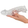 This transparent penis sleeve with extension and ball ring from Crystal visibly increases thickness thanks to its thick material and pronounced veins. The solid glans provides an additional 5 cm increase in length.