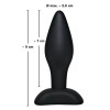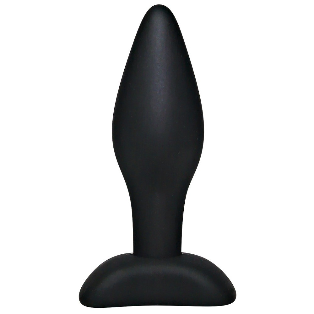 Black anal plug with a narrow tip and wider shaft, designed for progressive and comfortable stimulation. Smooth, silky surface for friction-free insertion. With safety base for greater control.