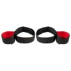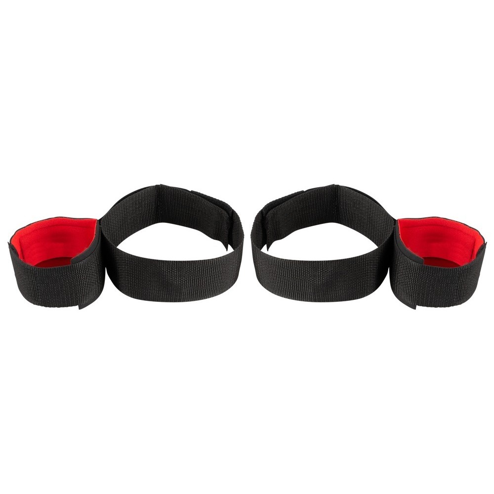 The handcuffs are securely attached to the thigh restraints. They both have hook and loop fasteners. Outer material is made out of tearproof synthetic fibre (100% polyester), the material on the inside is made out of 100% cotton. The inside is padded wth soft foam.