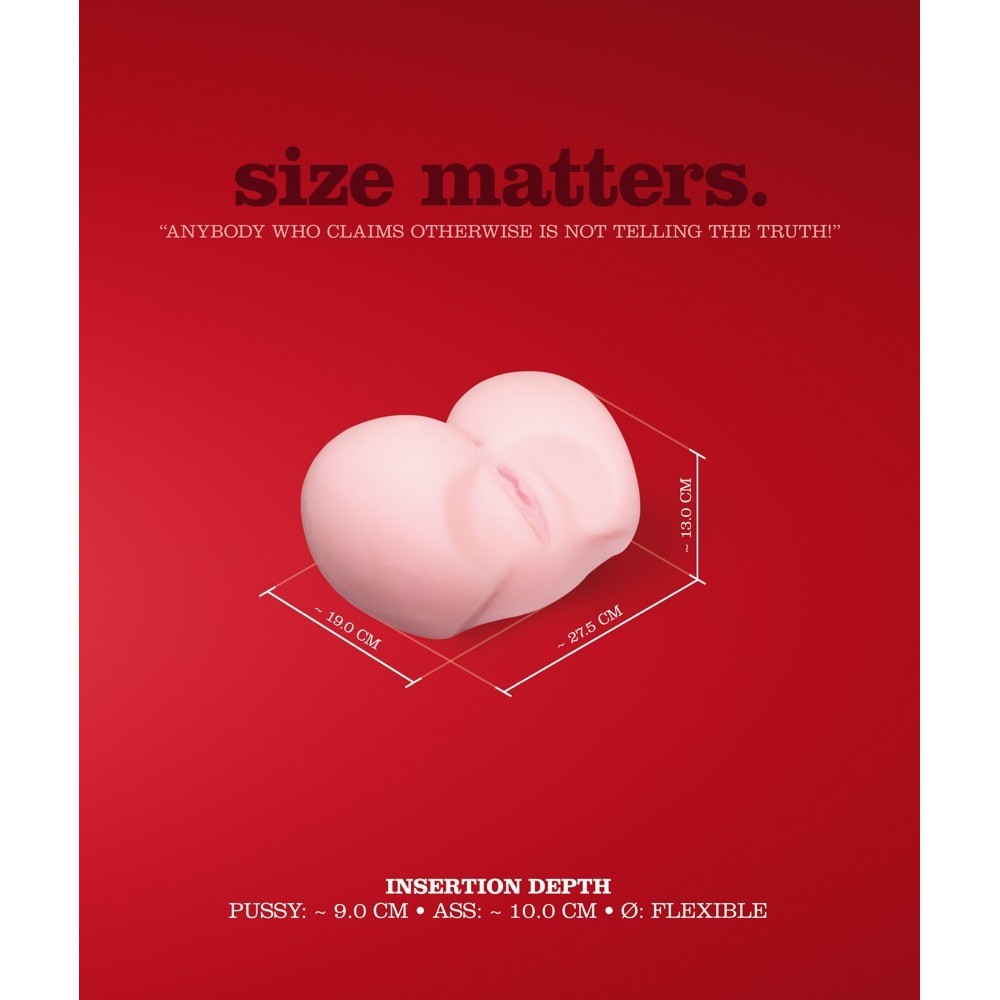 Skin-coloured masturbator in the shape of a bum. The openings are realistic replicas of a vagina and anus. There are dots inside the vagina (9 cm deep) and grooves inside the anus (10 cm deep). 19 cm long, 13 cm high, 27.5 cm wide, Ã very flexible. Weight 3.7 kg. TPE.