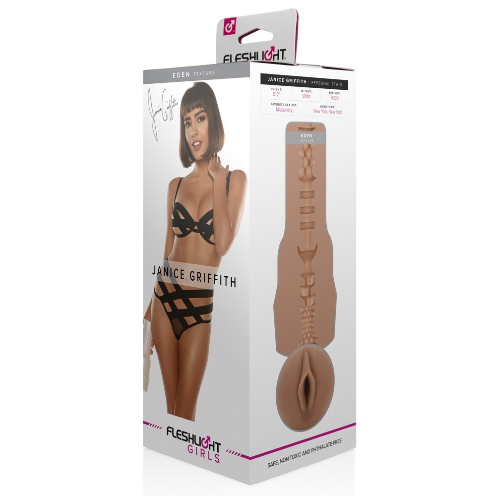 The Janice Griffith Eden masturbator from Fleshlight features a discreet torch-shaped design and includes a faithful replica of the actress's vagina. The varied interior, with different widths, approximates the feel of a tight vagina, providing an intense and stimulating massage during use. Made from super-soft skin-like material, the masturbator includes Janice's autograph next to the opening and is removable for easy cleaning.