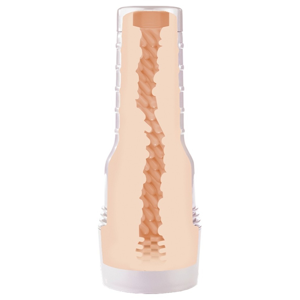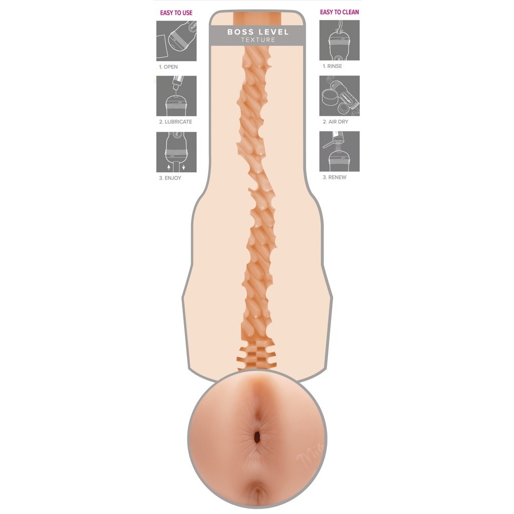 Mia Malkova Boss Level masturbator from Fleshlight, in a pearl white case, with a realistic replica of the anus of adult film star Mia Malkova. The tight but flexible pleasure channel features dots and grooves of varying sizes inside, providing intense stimulation. Includes cap and the star's signature next to the anus opening. Made from skin-like SuperSkin material, the masturbator can be easily removed from the case for cleaning.