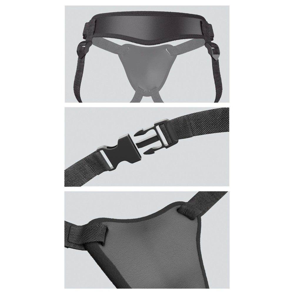 This simple strap-on system is based on an anatomically curved coupling plate, to which any vibrator or dildo with a suction cup (not included) can be attached. The dildo or vibrator is held perfectly in the ideal position for thrusting movements (Push & Play).