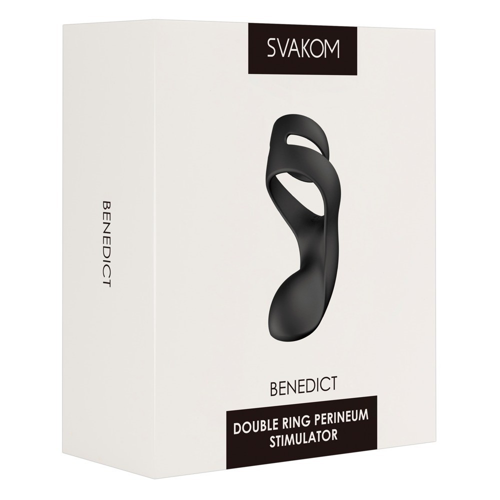 SVAKOM's Benedict is a combined penis and testicle ring with an integrated perineum vibrator, featuring an anatomical design that fits the body perfectly. The ring and vibrator fit harmoniously and, thanks to their high flexibility, ensure comfortable use.