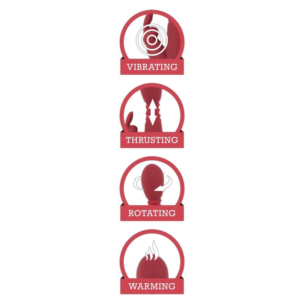 This red rabbit vibrator, with elegant black details, promises to ignite a fire of pleasure. The shaft features stimulating raised ridges for direct stimulation of the vagina and G-spot. The rabbit-shaped clitoral stimulator has sensual, flexible ears, offering an immersive experience.