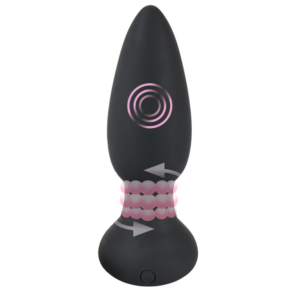 This anal plug provides intense stimulation thanks to its 7 rotation modes. It can be controlled via remote control, making it perfect for exciting games for two or intense solo fun. The numerous small rotating balls on the shaft create deep and incredibly pleasurable stimulation. The secure base prevents the plug from sliding too far inside. It is waterproof, allowing for hot moments in the bath or shower. Includes USB cable and 1 battery for the remote control (1 x 23A).