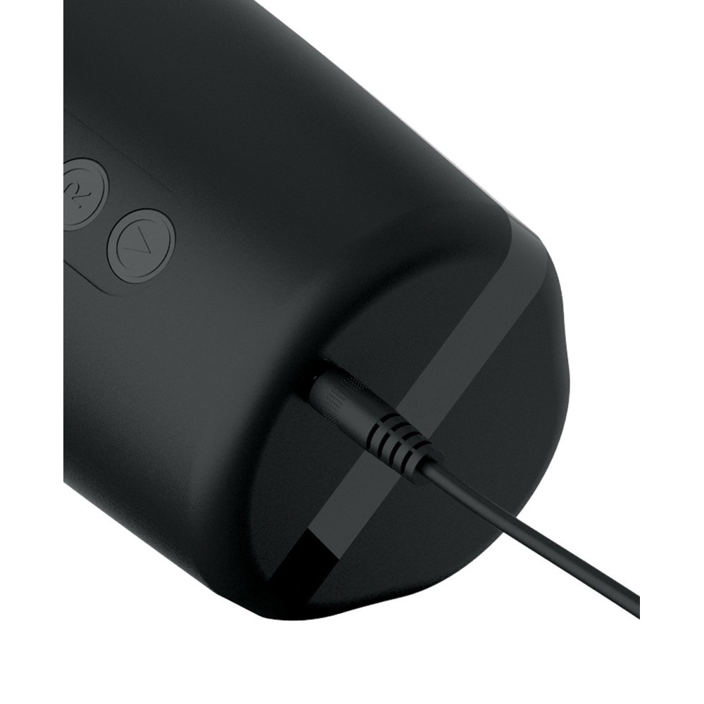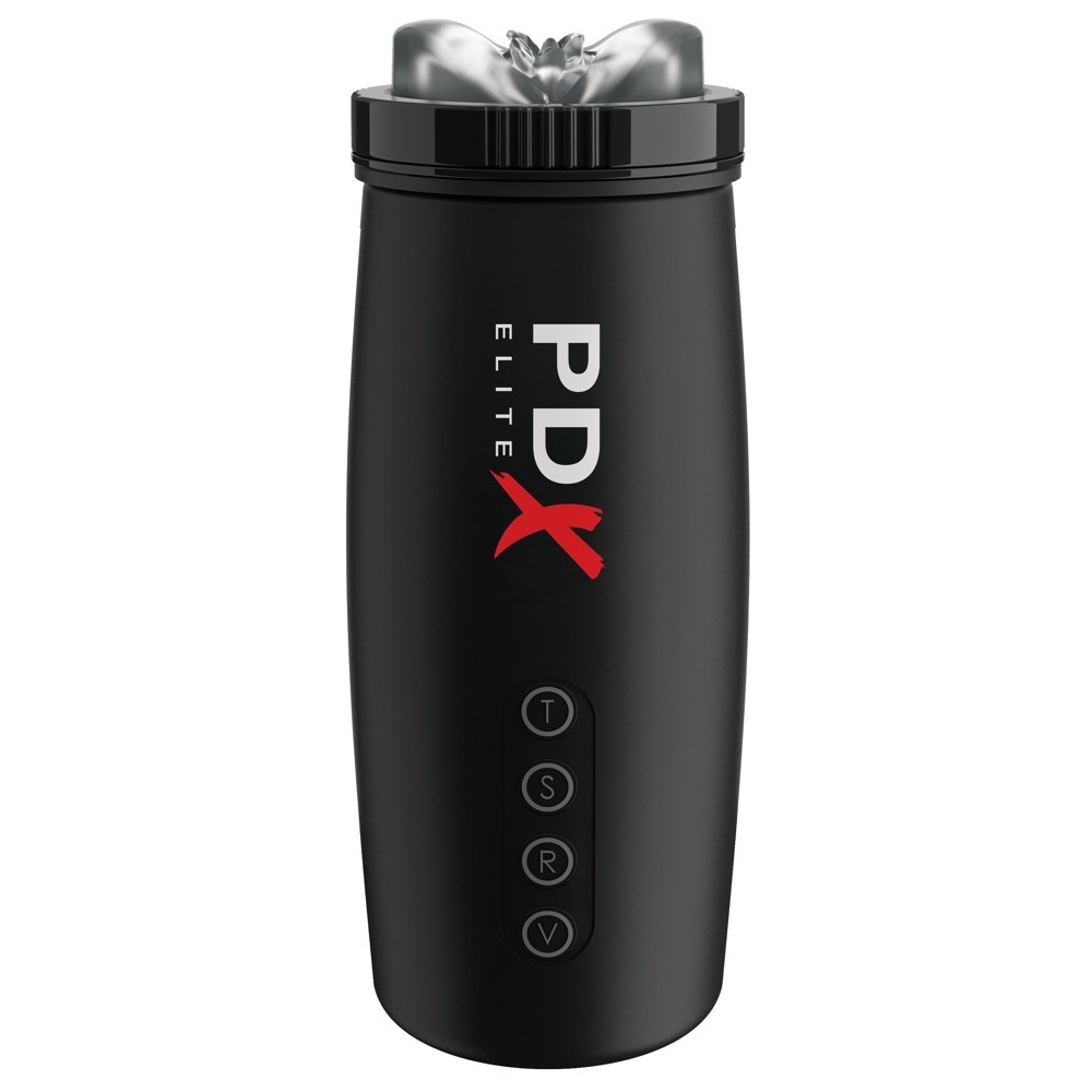 Black masturbator with two thrust speeds, five vibration modes and three suction modes, independently controllable. The pleasure tunnel is ribbed and dotted for intense stimulation.