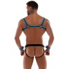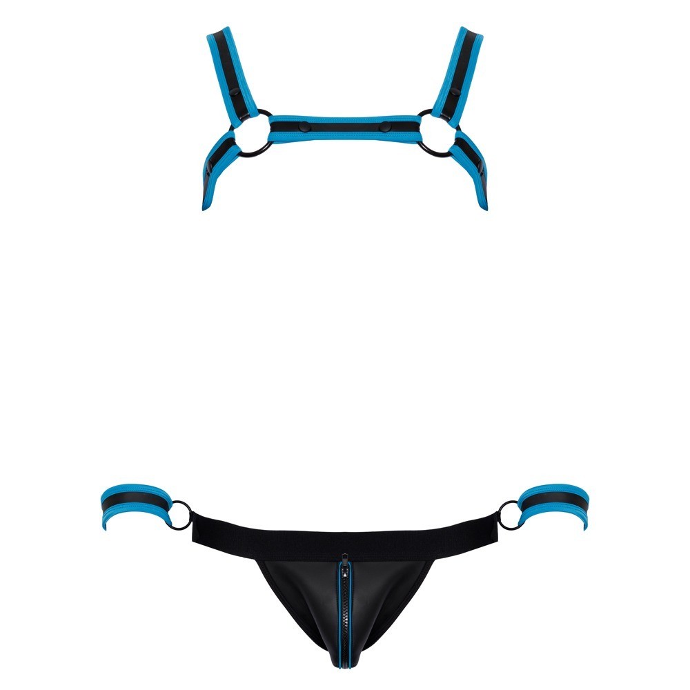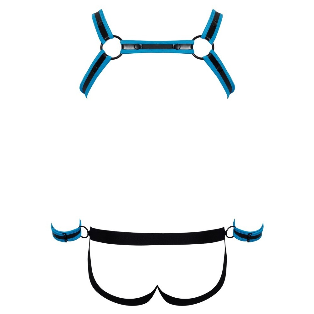 The Svenjoyment Bondage Set features a striking design in black neoprene with royal blue detailing, comprising a body harness, jockstrap and 2 handcuffs. The harness is easy to put on and take off thanks to the press studs. The jockstrap has a zip fastening beneath the pouch and an open design at the bottom, creating a provocative effect. The waistband features side loops for attaching the included handcuffs, which have adjustable hook-and-loop fasteners for a comfortable and secure fit.