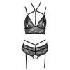 Set consisting of a bra and thong with suspenders, without crotch, by Abierta Fina. Delicate lace and extremely soft velvet combine in an exciting design, enriched with rose gold metallic elements and sparkling rhinestone rings. The bra features slits in the cups, velvet straps at the neckline and a hook fastening at the back. The thong with suspenders, without a crotch, includes a removable stimulating chain over the crotch area. The elastic straps, suspender straps and neckline straps are made of velvet and are adjustable for a perfect fit — the suspender straps are also removable.