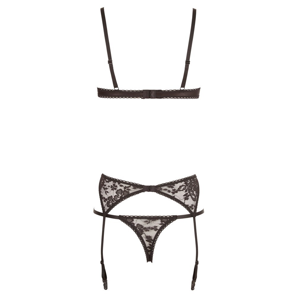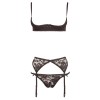 3-piece set consisting of a shelf bra, crotchless thong and garter belt. All three pieces are made of elastic black lace, which elegantly and sensually enhances your curves. The balconette bra has slightly padded cups with underwire, providing support and a seductive effect. The thong, open in the crotch area, adds a daring and provocative touch to the set.