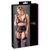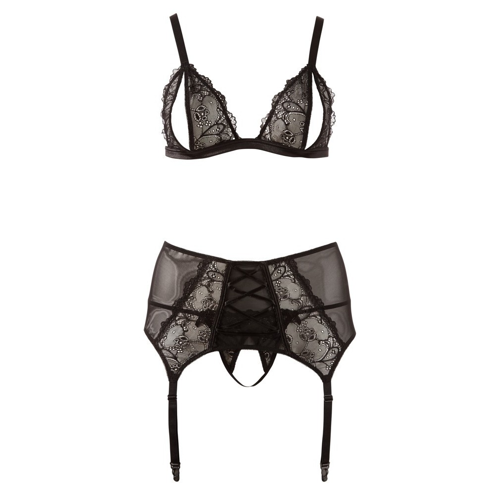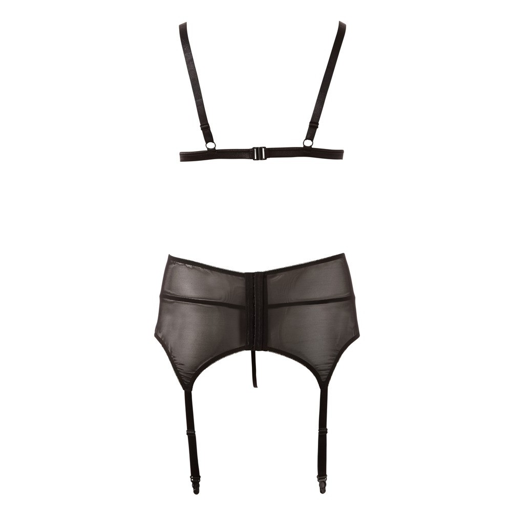 Wireless bra with open cups, adjustable straps and hook fastening at the back. Garter belt with decorative bow and four adjustable straps for a perfect fit.