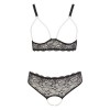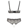 The wireless bra features a hook closure at the back, adjustable straps and elegant pearl chains over the breasts, standing out with unique charm. The matching thong has two pearl chains over the fully open crotch area for a sensual and sophisticated effect.