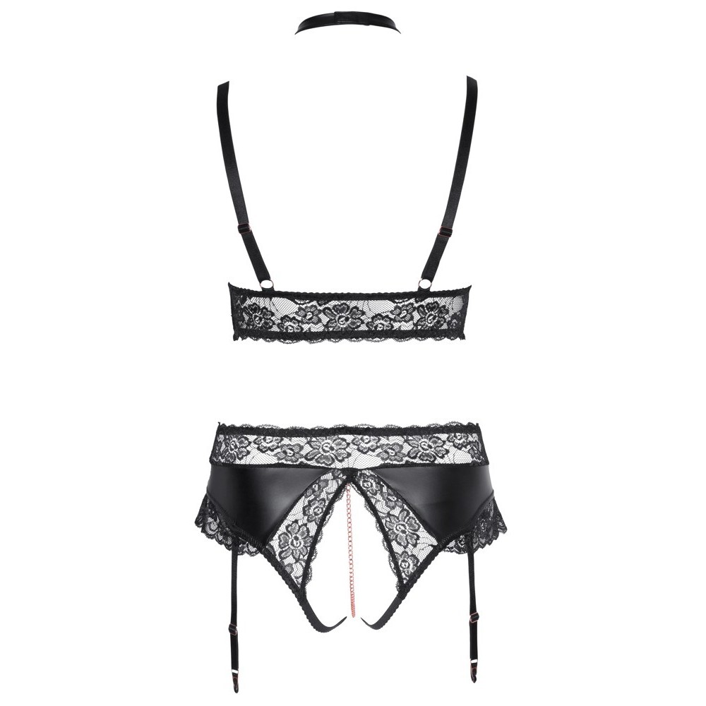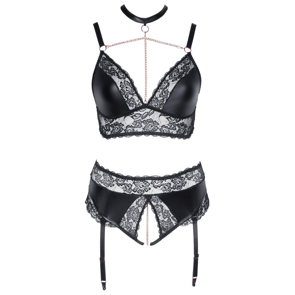 Wireless bra and thong with suspenders, no crotch, from Cottelli CURVES, made from a combination of matte finish material and soft, stretchy lace. The set also features elegant rose gold details. The bra stands out for its chains at the neckline that extend to the choker with a hook and ring clasp. The chains and choker are removable. The thong is completely open in the intimate area and includes a stimulating chain over the crotch. The suspenders are adjustable and removable.