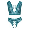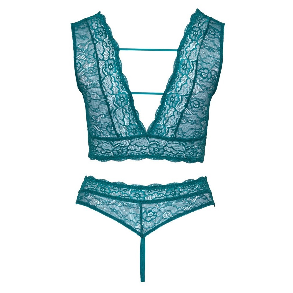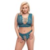 Bra and thong without crotch from Cottelli CURVES in an irresistible set, made entirely of soft and delicate lace in a teal blue tone. The bra has a deep neckline at the front and back, joined by elastic straps and elegant decorative rose gold rings. The high-waisted, crotchless thong stands out with its bold open front, held in place only by rings and elastic straps.