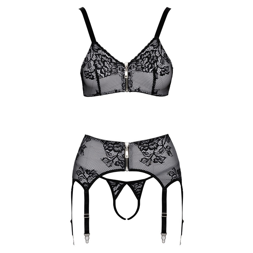 Soft bra, garter belt and crotchless thong set from Cottelli LINGERIE. All 3 pieces of black lingerie with white fronts covered in fine black lace. The soft, stretchy material makes them very comfortable to wear. The silver metal details complete the elegant look. The bra and suspender belt have a zip fastening at the front and a hook fastening at the back. The straps and 6 suspender straps are adjustable. The thong seduces with its completely exposed crotch.