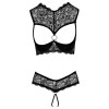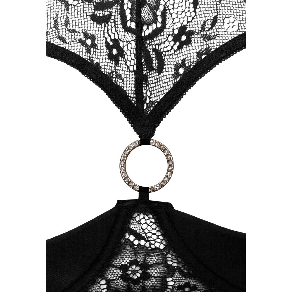 The thong is crotchless, decorated with lace trim and elastic straps that enhance the silhouette.