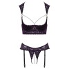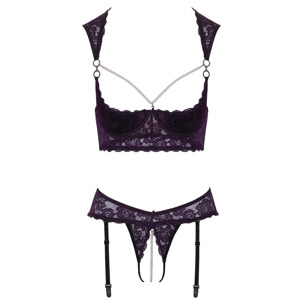 Cottelli LINGERIE set consisting of a deep-neckline shelf bra and thong with crotchless garters. It is made of dark purple lace with black details, decorated with silver rings and white pearls.