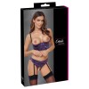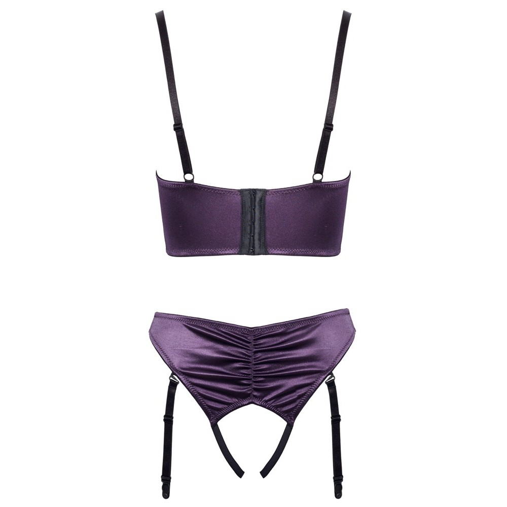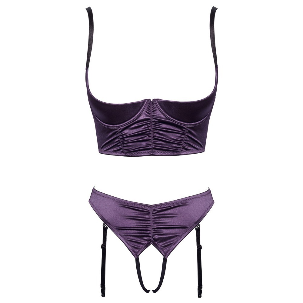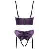 Cottelli LINGERIE set consisting of a square cup bra and thong with no crotch. It is made of dark purple stretch satin with an elegant ruffled effect and black details.