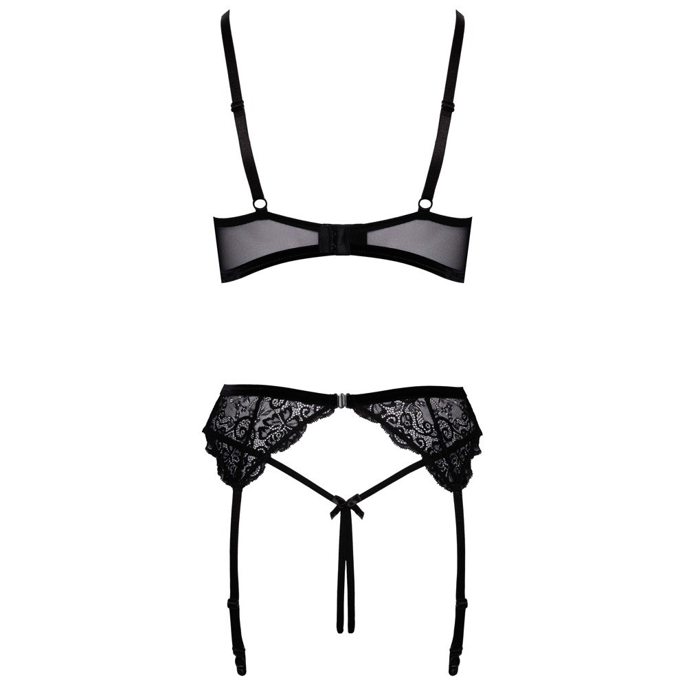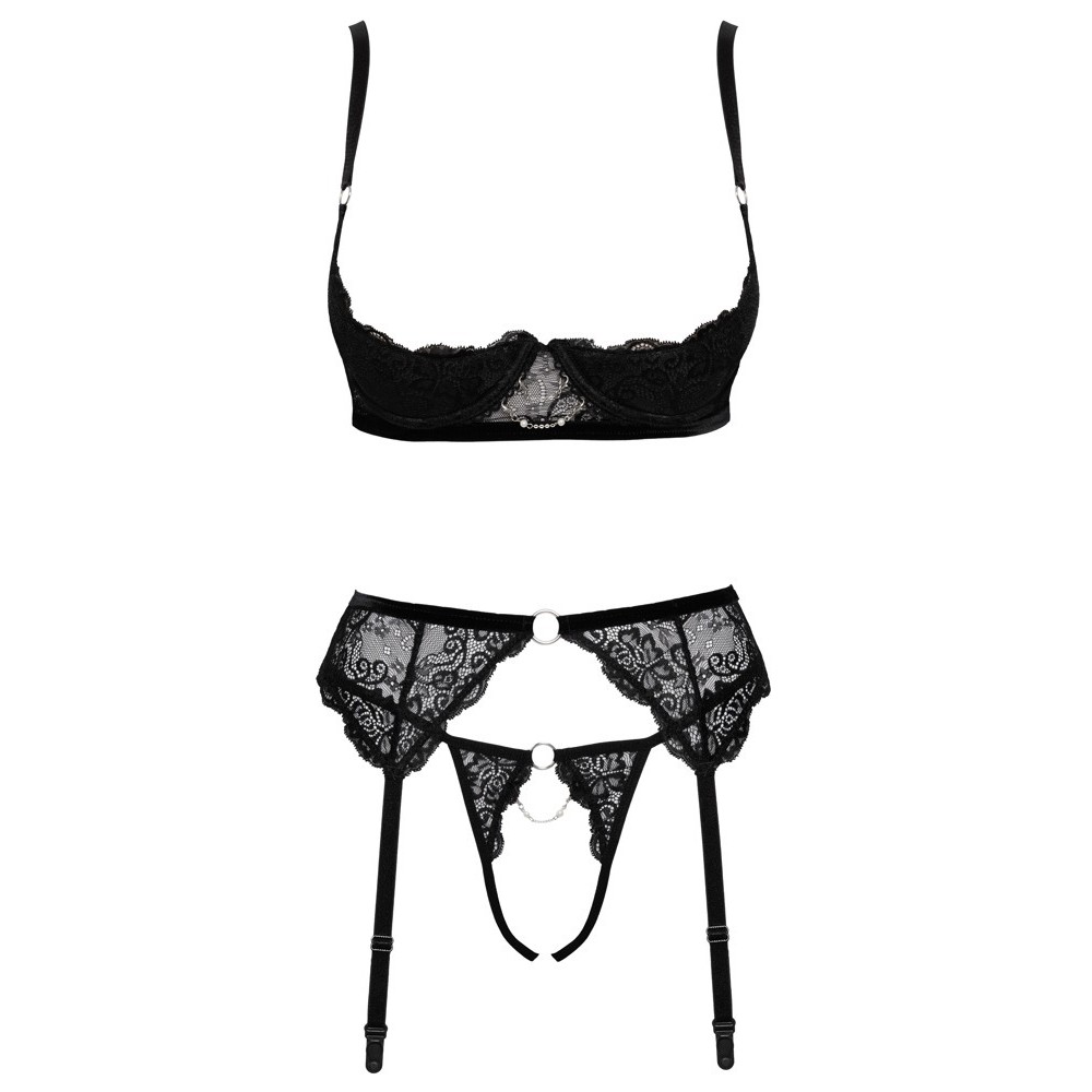 Cottelli LINGERIE set consisting of a shelf bra, garter belt and thong. All pieces are made of soft, stretchy black lace, decorated with silver rings and elegant velvet details.
