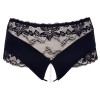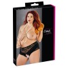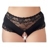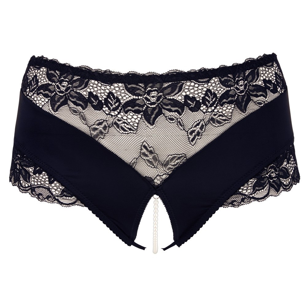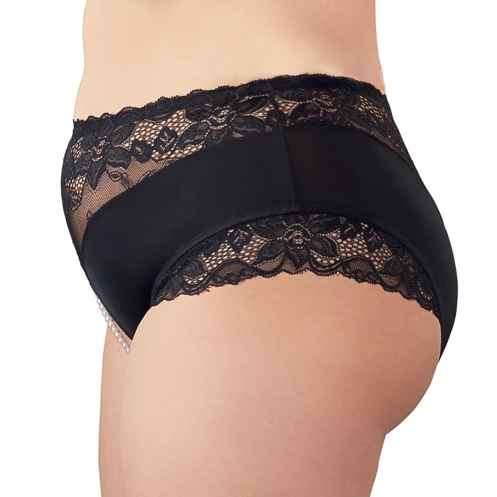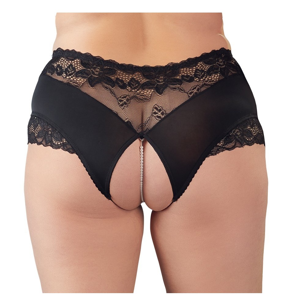 High-waisted black knickers with delicate lace inserts. An elastic row of pearls over the open crotch area stimulates the clitoris with every movement.