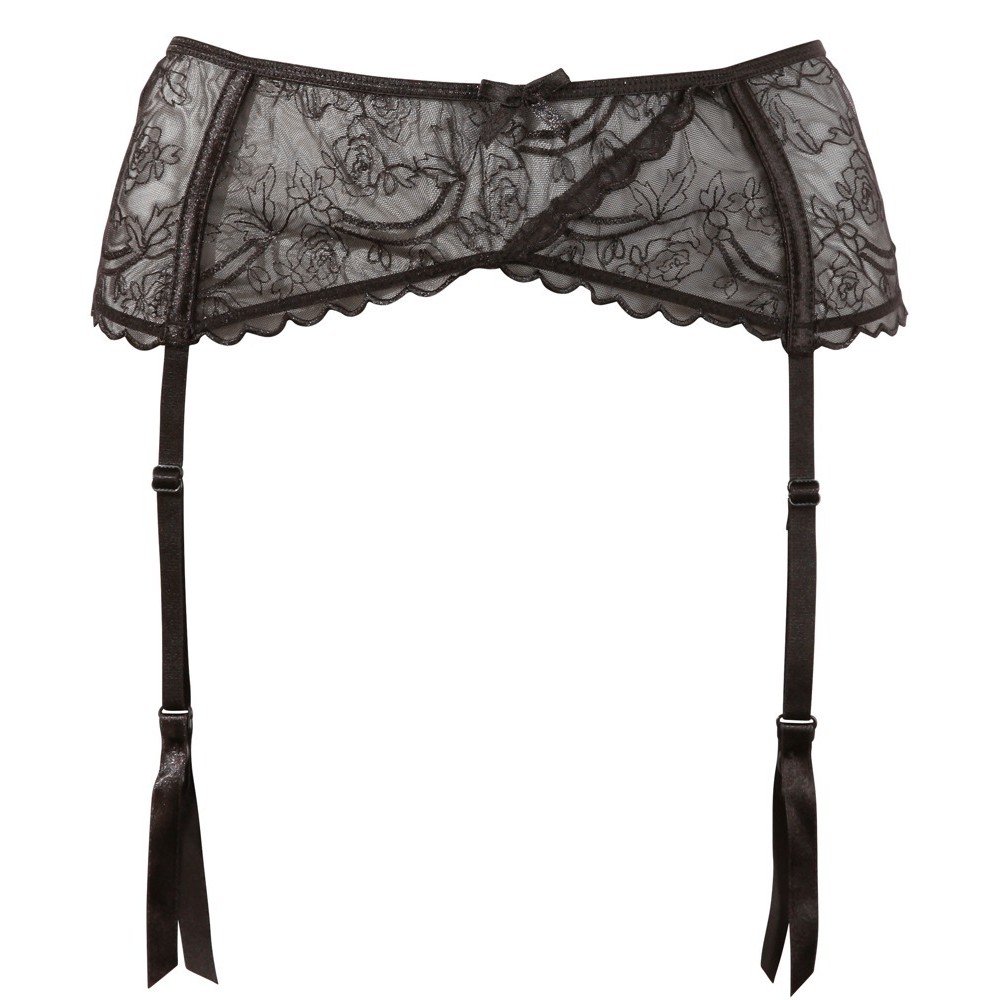 Garter belt with four adjustable straps and a hook fastening with two rows of hooks. Transparent black material with delicate embroidery.