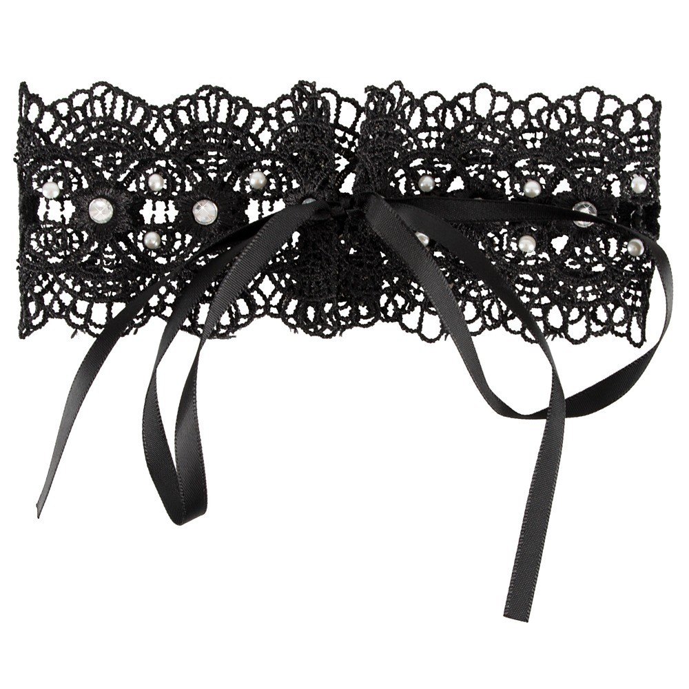 Black embroidered choker decorated with white pearls and rhinestones. There is a satin ribbon at the back to tie the chocker together.